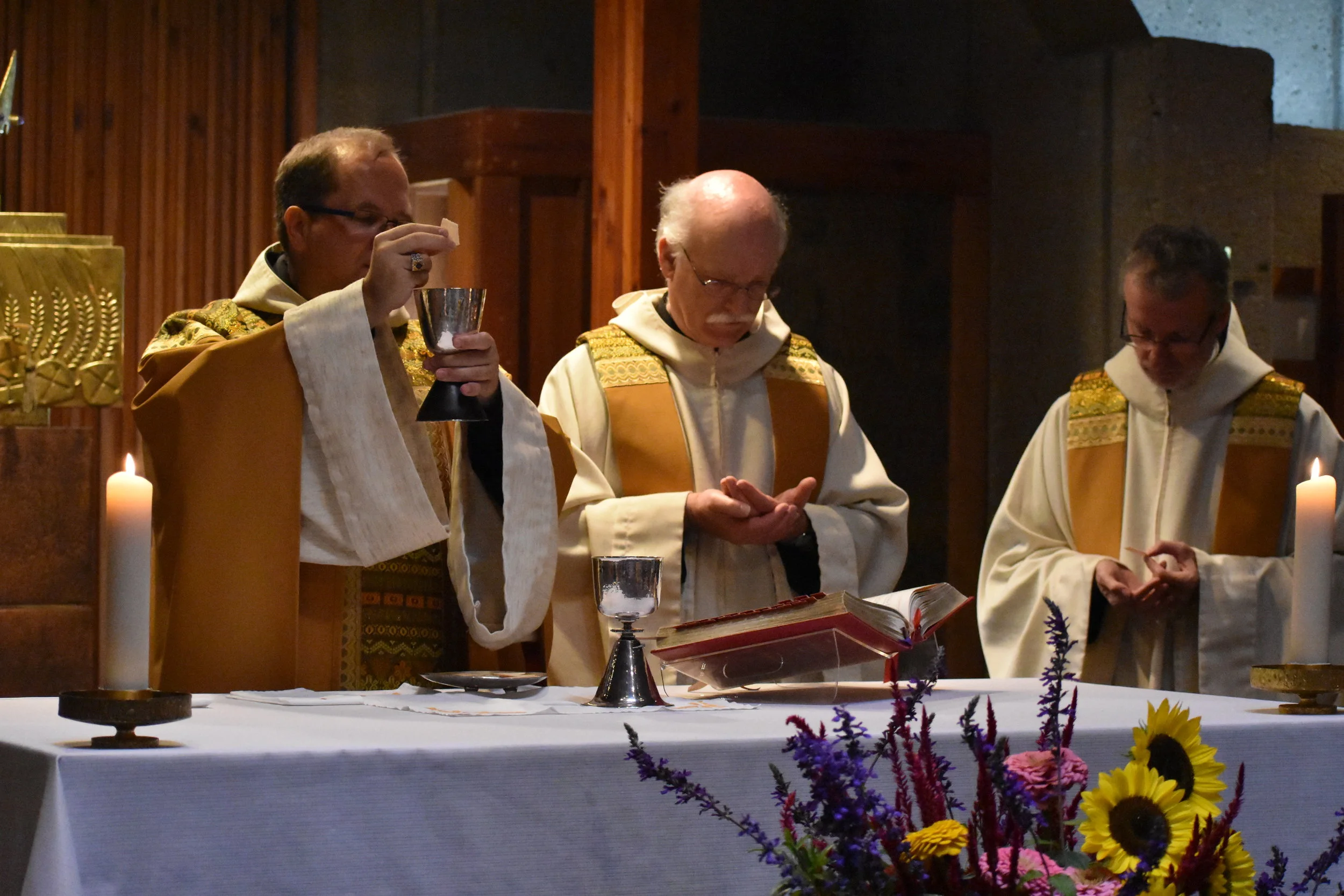 Today we celebrated the anniversary of the dedication of the church at Christ the King Priory. We were very blessed to have the President of our congregation with us – Abbot President Jeremias Schroeder. The Abbot President presided at Mass and was joined by Fr. Thomas Leitner, Fr. Tom Hillenbrand and our Prior, Fr. Joel Macul. Br. Tobias Dammert was the Cantor and Br. Andrew Fuller prepared the altar and assisted as server and lector.